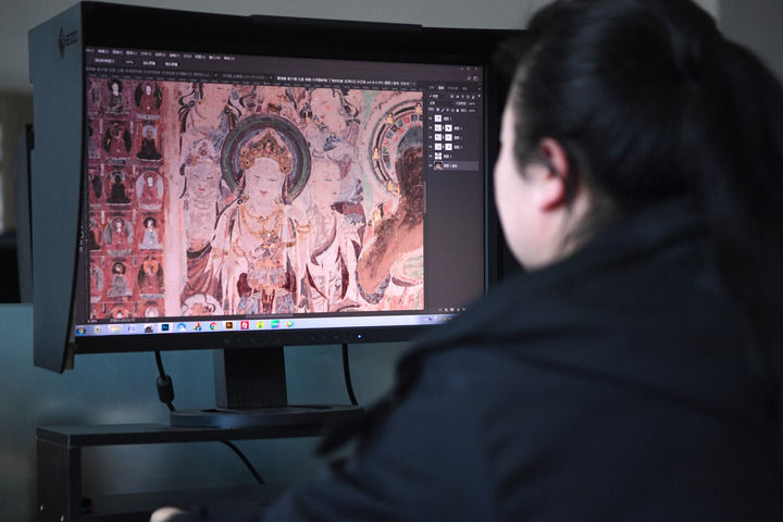 2023年4月25日,敦煌研究院文物數字化保護團隊圖像處理人員年海麗在拼接壁畫圖像。 新華每日電訊記者 陳斌 攝