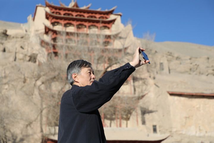 2022年2月23日,敦煌研究院院長蘇伯民正在用手機進行“數字敦煌”體驗。 新華每日電訊記者 張睿 攝