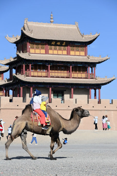 2023年8月7日,游客在嘉峪關關城外騎駱駝。 新華每日電訊記者 范培珅 攝