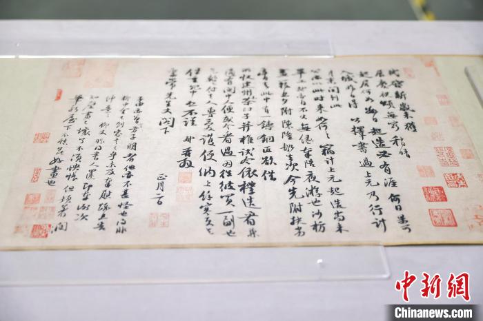 1月31日晚,“千古風流 不老東坡——蘇軾主題文物展”在海南省博物館開幕,圖為展出的蘇軾《新歲展慶帖》真跡。中新社記者 駱云飛攝