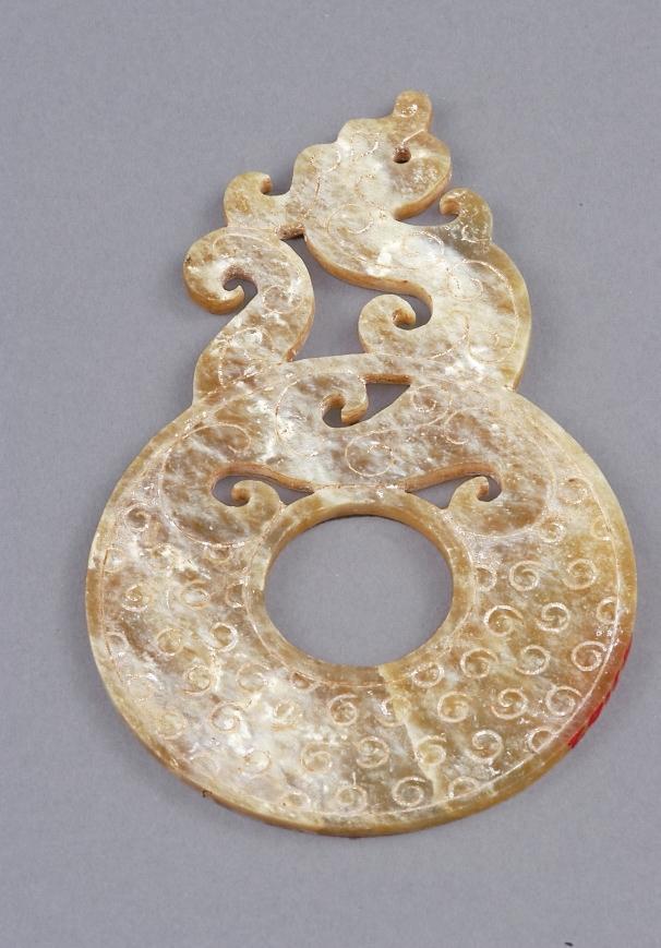 甘肅省博物館藏的漢代鏤雕龍紋璧,龍昂首,軀體屈曲,尾部上卷貼于首后,有騰空而起之勢。龍形玉器表現了古人將龍融入禮器之中,希望借此上達天庭,得到神靈與祖先的庇佑。