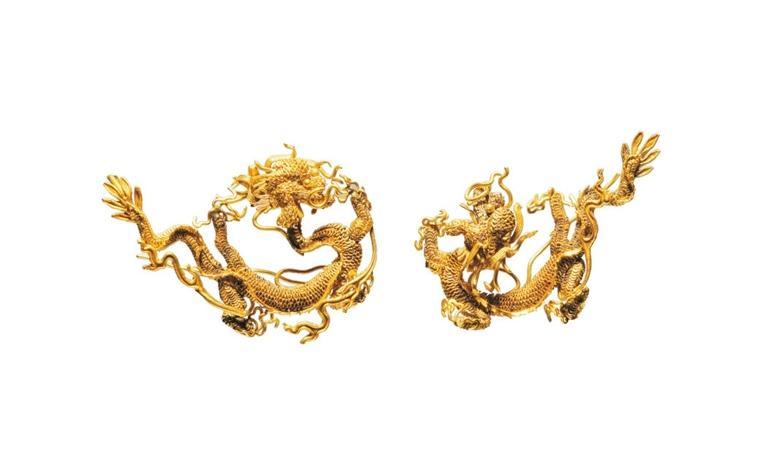 甘肅省博物館藏的明代累絲金龍,龍首聳額巨目,鬣發飛揚,神情兇猛;龍足屈伸相應,利爪如鉤;龍身似盤似舒,蜿蜒多態;龍尾分叉,形狀如葉,輕輕擺動,飄帶般長須刻畫出金龍瀟灑自由的雄姿。