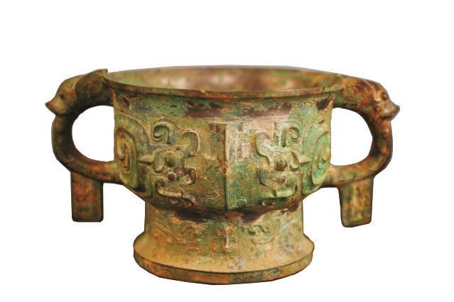 器物保存完整,紋飾十分講究,造型圖案十分精美,為國家一級文物。通高14.6厘米,口徑19厘米,底徑14.3厘米。鑄造工藝在西周時期屬于較為上乘之作。夔紋是圖騰紋飾,《說文》中云:“夔如龍而一足。”簋的兩邊為耳,呈環狀。上部各有一變形的龍首,顯得十分莊重、大氣。整個器物周身布滿綠銹,脫銹之處露出青銅光澤,透出歷史的厚重之美。