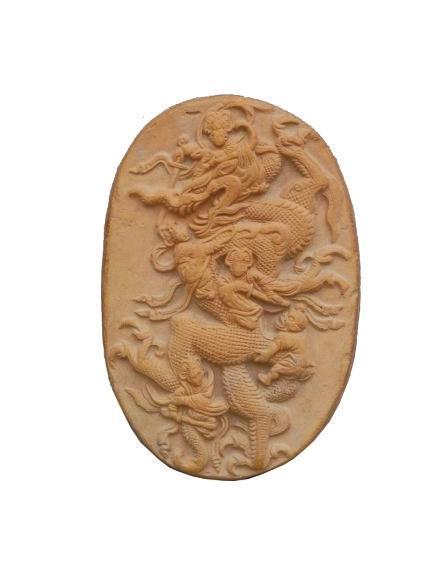 1990年出土于莊浪縣水洛鎮寺坪塬遺址。高11.7厘米,寬7.9厘米,厚1.5厘米,呈橢圓形。泥質紅陶,背面平素。畫面表現的是某神話故事,正面飾淺浮雕紋飾,正中為一巨龍張牙舞爪、怒目圓睜、奮力騰空,一女神左手緊抓龍角,右手持劍欲砍龍首;龍頸部有一女神拿繩索套縛,另一女神在龍胸部作拔劍狀;一力士則用力拽龍尾,凸目張嘴,聲色驚恐萬分;在龍的后肢旁還有一女神右手握劍砍殺。五神皆神態各異,造型逼真,生動表現了五神伏龍時驚心動魄的場景。
