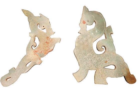 這對戰國谷紋玉龍,一個完整,一個略有殘缺。春秋戰國的龍,龍身很長,蜿蜒曲折,一般成對出現。龍身的裝飾,以谷紋或勾云紋為主,造型較多見的有蟠龍、行龍、虬龍、夔龍。戰國的龍身形態各異,基本上有個共同特點—“水滴眼”,龍頭多為“連云頭”,廓線出鋒,棱角分明。裝飾上多為陰刻和浮雕工藝。