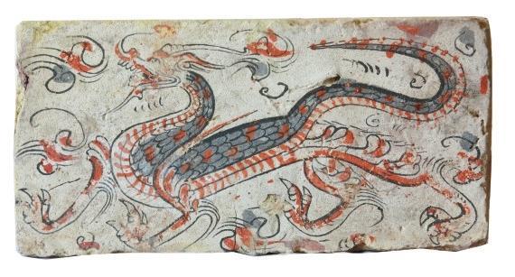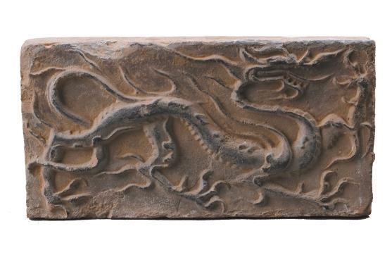 磚面上龍的形象棱角分明,骨架清瘦。龍身前屈后伸,起伏轉折,龍首高昂,張口吟嘯。前肢呈登騰狀,后肢做行進狀。鬣鬃飛揚,揚爪攪尾,四爪如鷙,整條龍動態十足,形象逼真,為五代時期模印花磚中的精品。