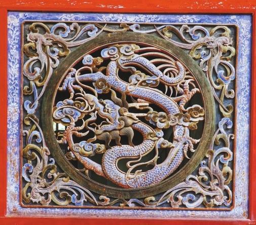 天水伏羲廟位于天水市秦州區西關伏羲路,是目前我國規模最宏大、保存最完整的紀念伏羲氏的明代建筑群,1963年被列為甘肅省重點文物保護單位。伏羲廟中有一對龍鳳檻窗木雕,是明代木雕中天水雕刻技法傳世至今的佳作,約有500年歷史。當時匠人將多塊油松木板拼接成方形,再以透雕技法在框內圈雕圓形,中刻龜背舞鳳,外飾祥云蝙蝠,龍鳳雀躍,惟妙惟肖,最后用礦物顏料上色點睛。龍鳳檻窗木雕將藝術性和功能性完美統一,承載了諸多文化寓意。有學者認為,這組木雕的圖案既歌頌了伏羲開創中華文明的豐功偉績,又體現了對古文化的一脈傳承。