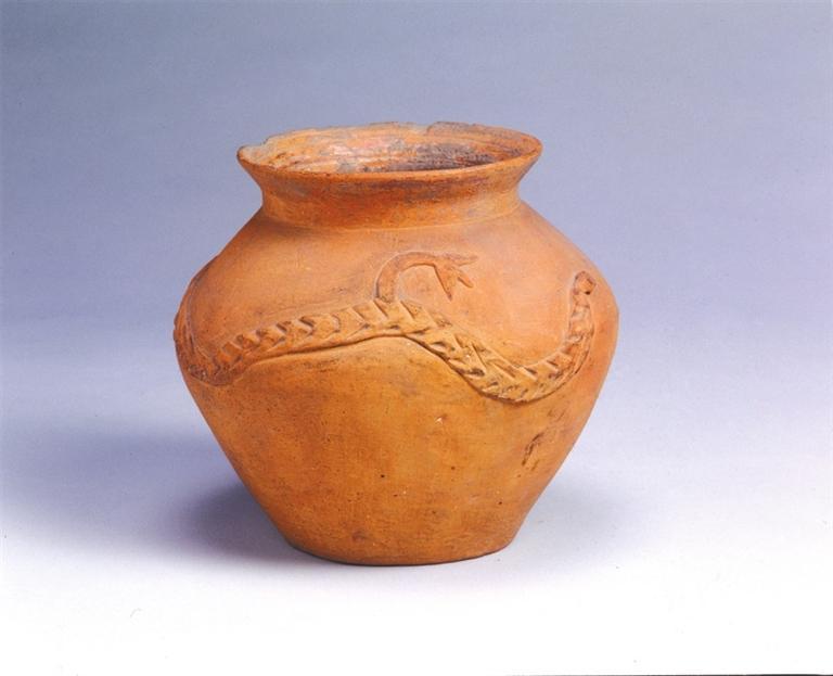 這條龍,是采用凸堆手法雕塑于一件無(wú)耳、束頸紅陶罐之上,它出土于臨夏廣河縣齊家坪遺址。別看它貌不驚人,和眾多同時(shí)期出土的陶罐也無(wú)二致,但它卻是一件國(guó)家一級(jí)文物。