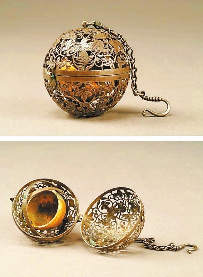 香囊最出彩的地方是機環常平架技術,是一種利用球體內兩個同心機環與中央焚香盂之間的重力作用,使其在自由轉動的時候,始終能保持平衡的機械原理。唐代的香囊豐富多樣,這種金屬造型的香囊設計更為機巧精致,深受妃后、貴婦們所推崇喜愛,它上承漢代的常平架技術,下延現代陀螺儀萬向支架技術,是中國古代科學技術與手工藝技術對世界的杰出貢獻。