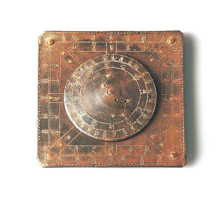 1972年武威市磨嘴子漢墓出土的這件漆栻盤,直徑6厘米,厚1厘米,地盤邊長9厘米,木胎,髹深褐色漆。由圓形的天盤和方形的地盤構制而成,天盤位于地盤之上,正中心以竹軸貫聯,使天盤可以轉動。天盤中陰刻兩個同心圓,將其分為三區:內區以竹珠鑲嵌北斗七星,星間刻線相連,斗柄中節穿過圓心。中區內隸書陰刻十二月神,外區陰刻篆書二十八宿名。地盤以兩個相套的正方形分為三區:內區納天盤,中區陰刻篆書十天干中的八干(不刻戊己)和十二地支名,外區陰刻篆書二十八宿名。