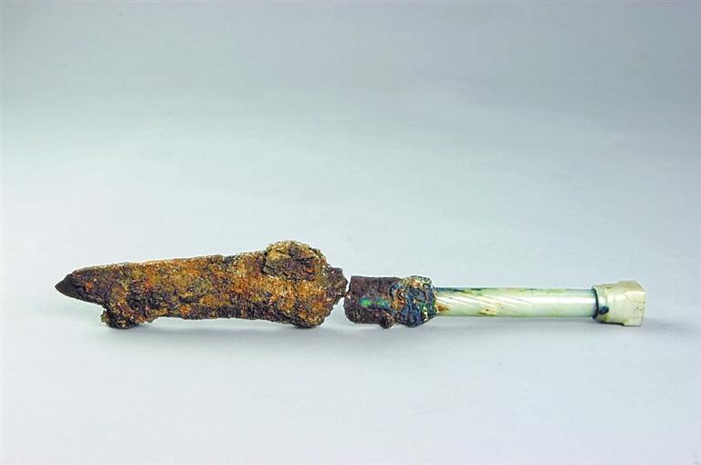 玉柄鐵劍出土于河南三門峽虢國國君虢季的墓葬,全長34.2厘米,其中劍柄長12.2厘米,劍身長22厘米。劍柄為銅芯,起到連接劍柄和劍身的作用,銅芯外鑲有晶瑩透亮的和田美玉和綠松石,并有精美的竹節飾紋,劍身和劍柄的結合處也鑲有綠松石。劍身經由北京科技大學冶金與材料史研究所鑒定,是由塊煉法鍛制而成,劍身外有絲織品包裹的痕跡,應當是被絲織品包裹后放入劍鞘。劍鞘則由牛皮精制而成。這把玉柄鐵劍不僅制作精美,而且其利用玉、銅、鐵三種材料制作而成,是我國目前考古發掘出土的年代最早的人工冶鐵制品。它將我國的人工冶鐵歷史推前了近兩個世紀,被專家們譽為“中華第一劍”。