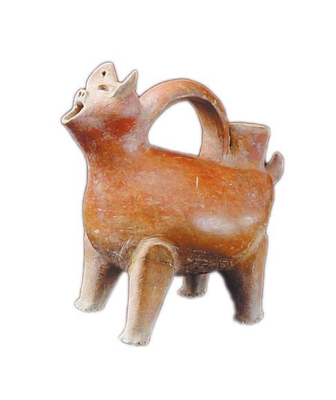 紅陶獸形壺,高21.6厘米,夾砂紅陶,通體磨光,遍施紅色陶衣,光潤亮澤。器型圓面聳耳,拱鼻,張口,耳穿小孔,四肢粗壯,短尾上翹,背裝弧形提手,尾根部一筒形注水口,嘴可往外倒水,腹部鼓起加大了容積,四足立起可供加熱,使用方便,造型生動美觀,集實用與仿生藝術于一身,是大汶口文化獨有的器形,充滿了創造性的靈感,是新石器時代一件難得的陶器珍品。