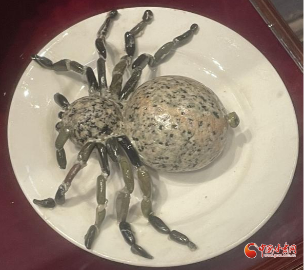 兩個花紋沒啥特點、一大一小的圓形石頭,再加上更細小的石粒,竟然被創作者粘連起來,打造成了一只“蜘蛛”,惟妙惟肖。