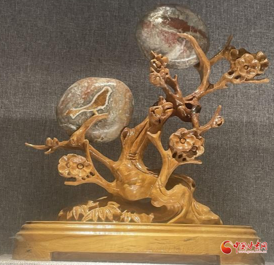 還有兩塊看似普通的小石頭,用樹根雕成的花架支撐起來,上方的石頭似圓月當空,下面的一塊花紋石,花紋類似一只鳥,這件作品起名“枝頭戀歌”,不得不佩服創作者的浪漫情懷。