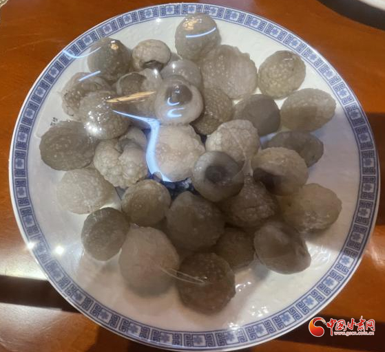 最令我過目難忘的是“中華百家宴”,我曾經在其他地方的玉器展上看到過“滿漢全席”,而玉器大多經打磨雕琢,太過匠心。臨洮洮河石文化博物館的這桌“中華百家宴”,則基本是石頭原貌,在大自然的雕琢下呈現出獨特的形態,更顯奇特曼妙。一碟碟的“珍饈佳肴”上覆保鮮膜,有剛剝了殼的軟嫩荔枝,有點綴著紅辣椒綠蔥花的連皮燉肉塊,有表面起酥的炸肉串......看在眼里就覺鮮香可口,令人垂涎欲滴。若不是隔離繩攔著,若不是每個碗碟上都有保鮮膜蓋著,看到忘乎所以,若是拿起筷子夾一塊大快朵頤,滿嘴牙怕要分崩離析。