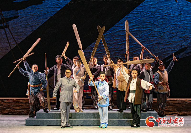 隴劇《大河?xùn)|流》于19日晚在甘肅黃河劇院成功首演。該劇以20世紀(jì)30年代末抗戰(zhàn)為背景,運(yùn)用具有地方特色的隴劇形式,生動(dòng)地描繪了大西北黃河邊的一群筏客子在國家危難之際,如何放下個(gè)人恩怨,團(tuán)結(jié)起來支援抗戰(zhàn),組成水上大型運(yùn)輸隊(duì),將大量物資安全送達(dá)抗戰(zhàn)前線,創(chuàng)造了“羊皮筏子賽軍艦”的傳奇故事。(甘肅省隴劇院供圖)