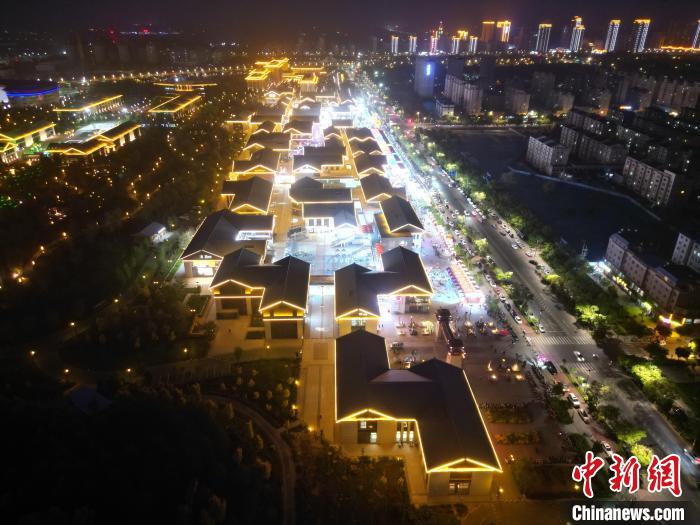 圖為明清街夜市燈光點亮具有武威文化元素的“天梯山石窟”彩燈。(無人機照片) 戴文昌 攝