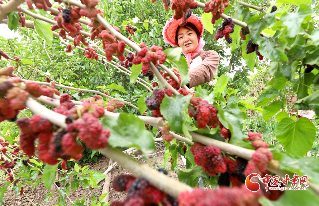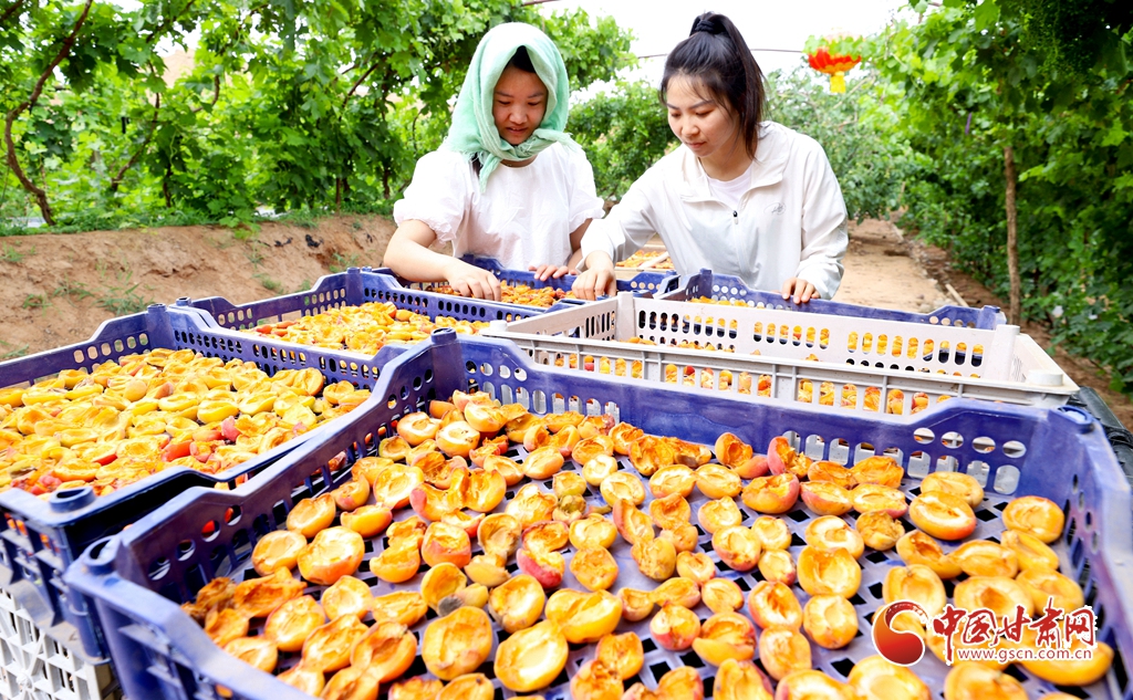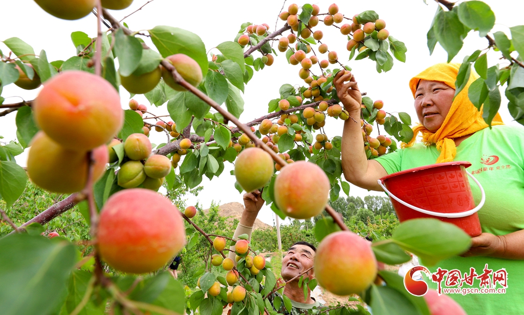 6月5日,在張掖市臨澤縣板橋鎮,果農們正在采摘成熟的杏子、桑葚、葡萄。
