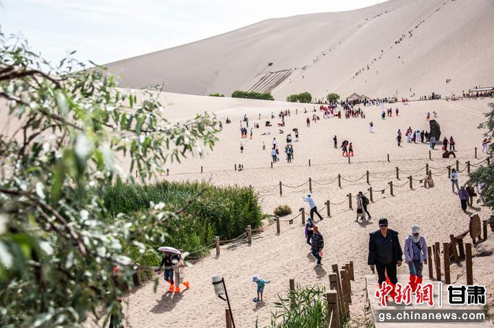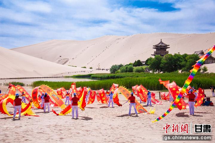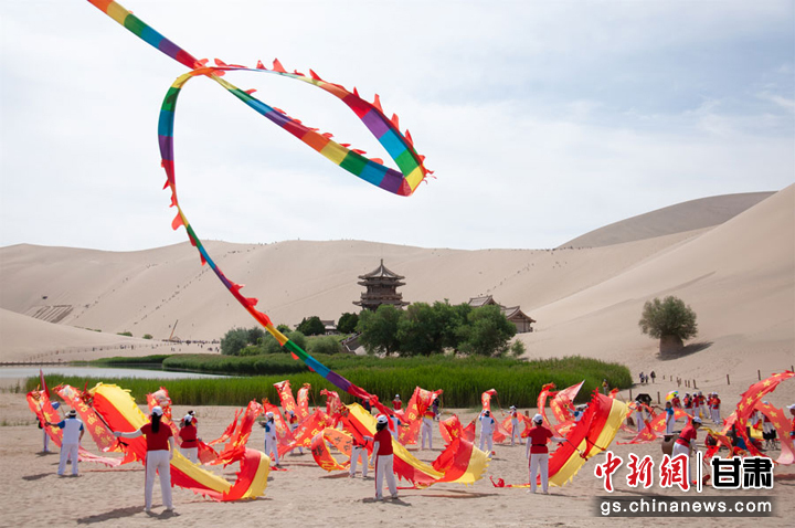 6月10日,敦煌市鳴沙山下,一場以敦煌市舞龍隊為首的20個健身舞蹈隊為廣大市民和游客獻上一臺臺精彩的舞蹈盛宴,吸引了眾多游客圍觀、拍照,在敦煌大漠度過一個難忘的端午節。王斌銀 攝