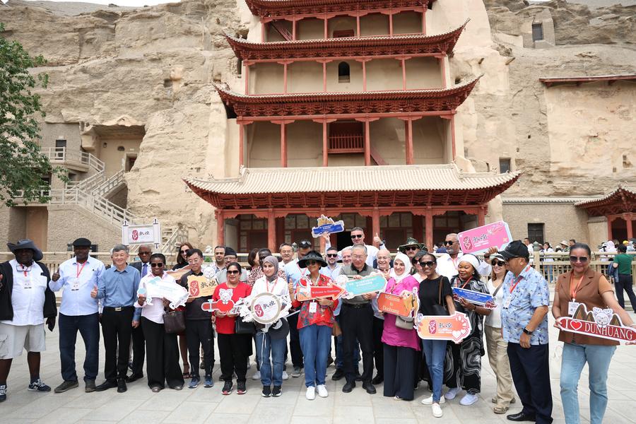 6月6日至8日,來自22個國家的駐華使節和高級別外交官走進敦煌,尋訪莫高窟,游覽鳴沙山月牙泉景區,參加河西走廊五市的文旅專場推介會,并在對話會上共同探討“絲路精神推動文明交流互鑒”。