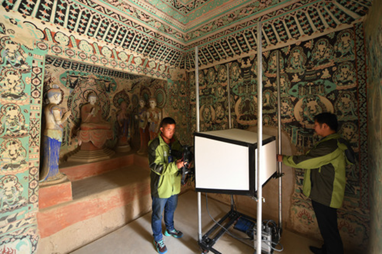 圖為在敦煌莫高窟第376窟,工作人員開(kāi)展數(shù)字化采集工作(2017年4月17日攝)。新華社記者范培珅攝