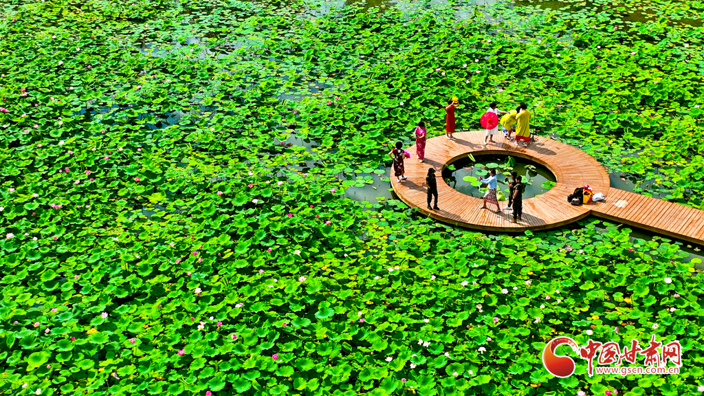 6月30日,雨后天晴的甘肅省張掖國家濕地公園碧水藍天、綠意盎然,荷塘里的荷花相繼綻放,處處呈現出蓬勃生機,眾多游客和市民在葦溪、湖泊間游玩拍照,親近大自然。