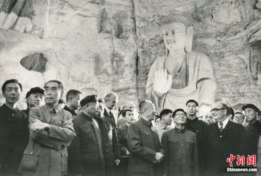 1973年9月15日,周恩來總理陪同時(shí)任法國總統(tǒng)喬治·蓬皮杜視察云岡石窟。云岡研究院 供圖