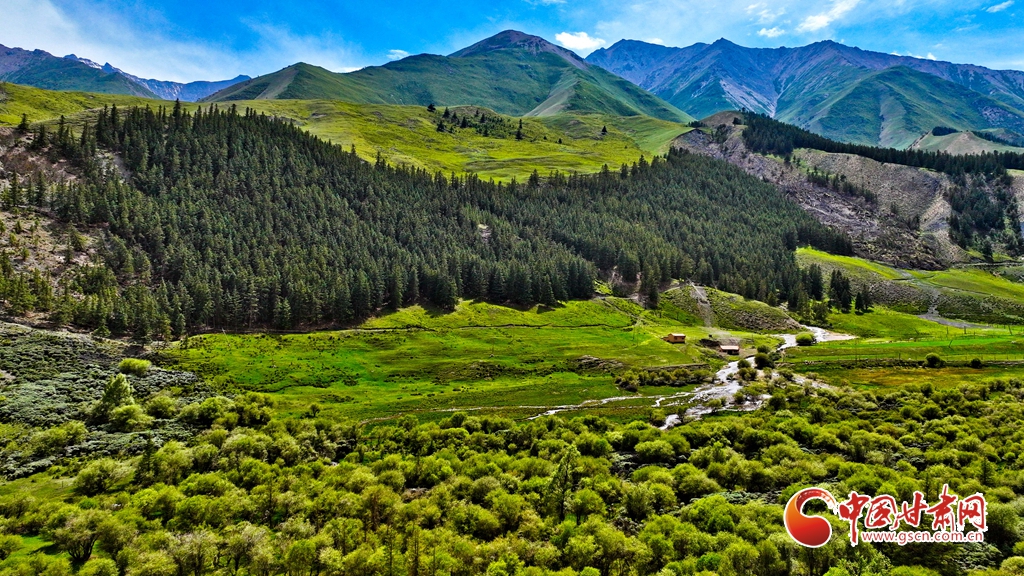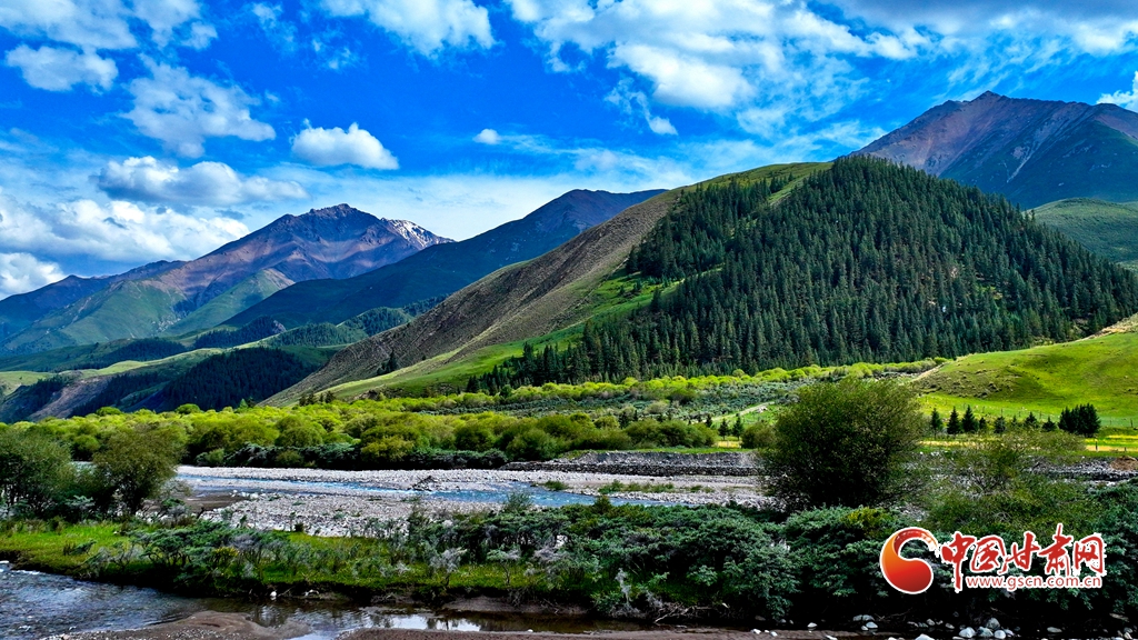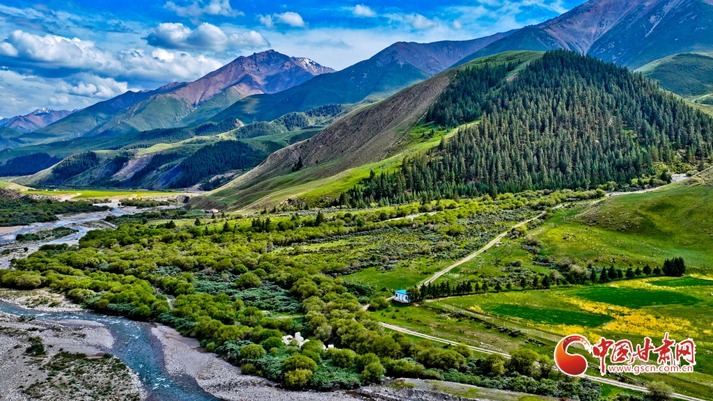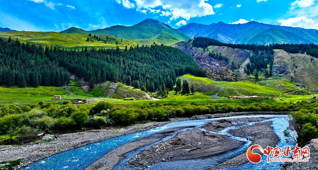7月2日,祁連山國家公園甘肅省張掖市肅南裕固族自治縣大河鄉段,在高原藍天白云映襯下,群山環抱、 雪峰高聳,鳥鳴聲陣陣的濕地、奔騰不歇的黑河水、猶如“巨幅綠毯”的草原,勾勒出一幅風光壯美的生態畫卷。