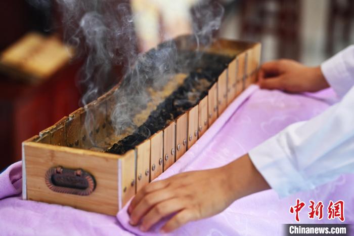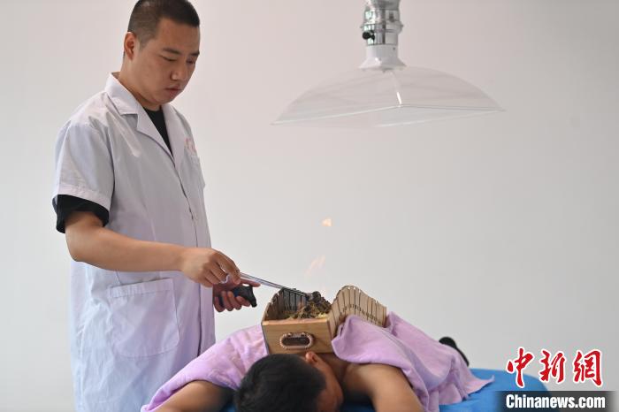 7月16日,甘肅省平涼市靈臺縣皇甫謐針灸康養館內,工作人員對患者進行火龍灸治療。2006年,靈臺皇甫謐針灸術入選第一批甘肅省非物質文化遺產名錄。靈臺作為皇甫謐故里,當地民眾非常認可中醫康養,針灸、拔火罐、推拿、葫蘆灸、火龍灸(督脈灸)等中醫特色療法受到了很多人的青睞,當地官方也通過舉辦大型節會等助推中醫康養產業發展。 皇甫謐是針灸醫學鼻祖,其《針灸甲乙經》已在多個國家被廣泛傳播應用。中新社記者 李亞龍 攝
