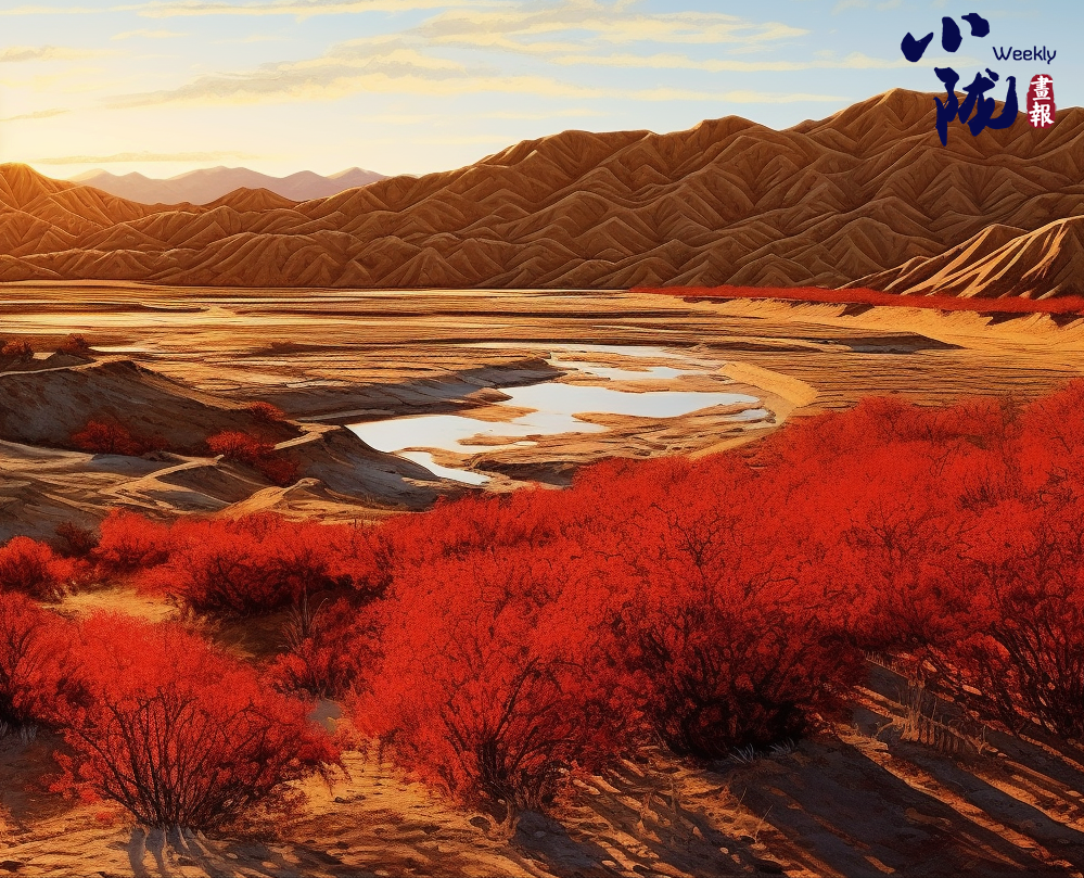 沙漠的沙粒在晚霞的映射下變得金黃而溫暖,仿佛覆蓋了一層光暈。遠(yuǎn)處的山峰也被晚霞點(diǎn)亮,宛如一座座火焰般迎接著夜晚的到來(lái)。