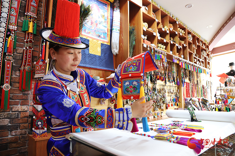 在富達民族服飾工藝品加工坊里,大河鄉紅灣村裕固族姑娘顧婷,理線、穿針、落針……各種配飾在她指尖翻轉騰挪,不一會兒,就做成了一幅幅精美的荷包、項鏈、耳飾、腰帶……除此之外,她還會為顧客搭配不同場合需要的服飾、民族工藝品、地方特色旅游產品等。
