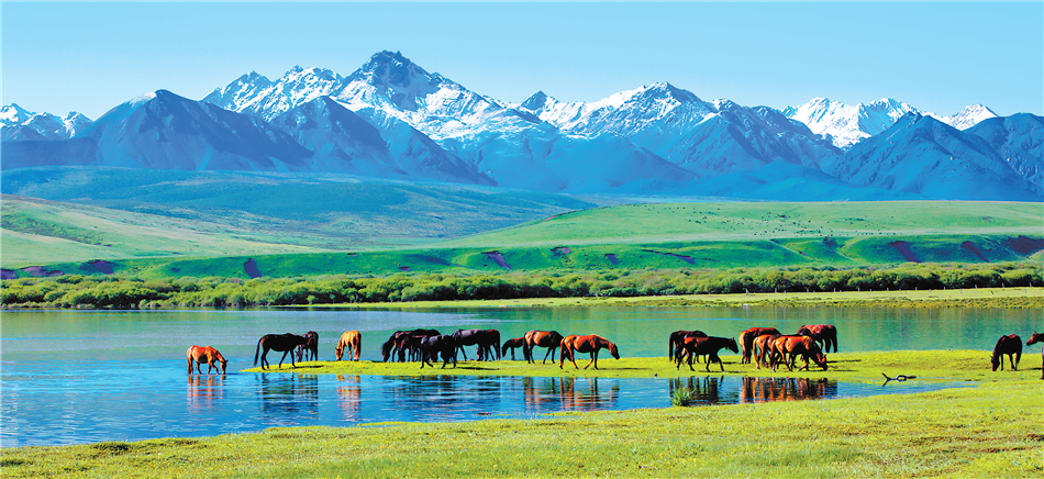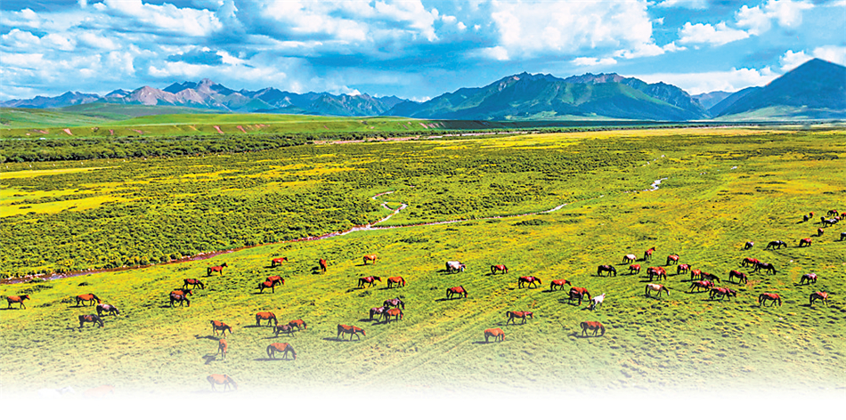 白雪皚皚的祁連山下,一眼望不到邊的大片牧草青翠碧綠,色彩斑斕的野花競(jìng)相開放,擁有百萬畝草原的山丹馬場(chǎng)如巨幅彩色畫卷徐徐展開。