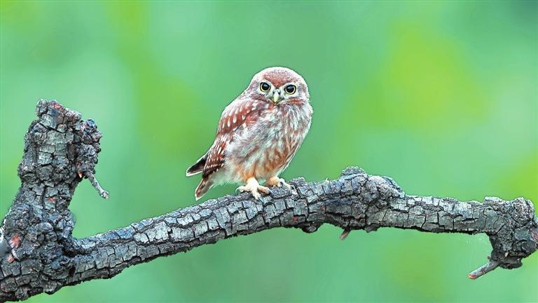 我近距離地看著這小小的、聰慧的鳥兒。它的上體是棕黃色的,散布著許多白點,頭上的白點比身上的更加細密。貓頭鷹脖子的轉動極限大約是270度,能水平轉,也能上下轉,這個“超能力”讓眼前的小家伙能更靈活機敏地打量我。它的眼周有一圈兒顯眼的白色,于喙的上方幾乎相連,變成兩道白色的眉毛,平添了幾分威武。