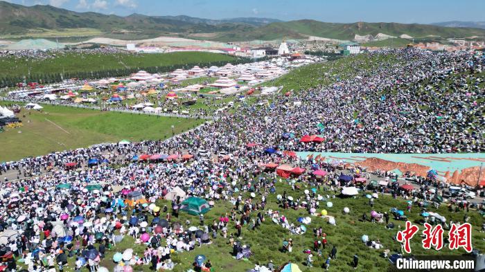 8月4日,人們在當周草原觀看九色甘南香巴拉旅游藝術節開幕式表演。當日,第22屆九色甘南香巴拉旅游藝術節在甘肅省甘南藏族自治州當周草原開幕。人們身著節日盛裝載歌載舞、歡聚一堂,馬隊巡游、千人鍋莊舞等活動精彩上演。九色甘南香巴拉旅游藝術節既是民眾浪山聚會的節日盛會,也是展現發展成就、擴大對外開放的重要窗口,更是展示民俗文化、促進廣泛交往交流交融的有效載體。(無人機照片)中新社記者 九美旦增 攝