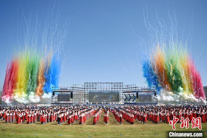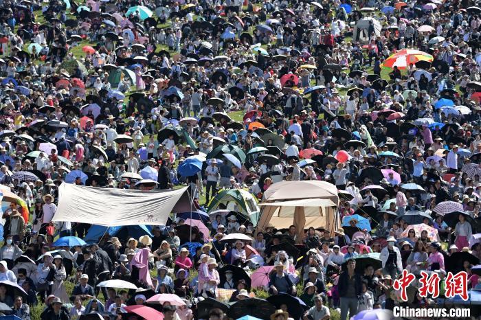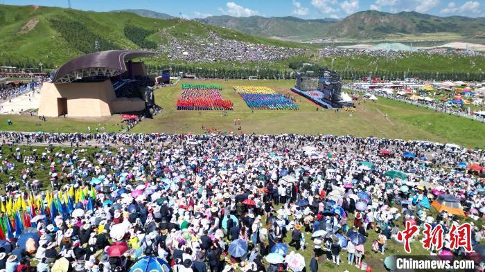8月4日,第22屆九色甘南香巴拉旅游藝術節在甘肅省甘南藏族自治州當周草原開幕。人們身著節日盛裝載歌載舞、歡聚一堂,馬隊巡游、千人鍋莊舞等活動精彩上演。九色甘南香巴拉旅游藝術節既是民眾浪山聚會的節日盛會,也是展現發展成就、擴大對外開放的重要窗口,更是展示民俗文化、促進廣泛交往交流交融的有效載體。圖為開幕式現場。中新社記者 九美旦增 攝