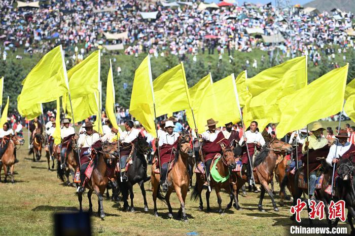 8月4日,藏族騎手在當周草原上表演馬隊巡游。當日,第22屆九色甘南香巴拉旅游藝術節在甘肅省甘南藏族自治州當周草原開幕。人們身著節日盛裝載歌載舞、歡聚一堂,馬隊巡游、千人鍋莊舞等活動精彩上演。九色甘南香巴拉旅游藝術節既是民眾浪山聚會的節日盛會,也是展現發展成就、擴大對外開放的重要窗口,更是展示民俗文化、促進廣泛交往交流交融的有效載體。中新社記者 九美旦增 攝