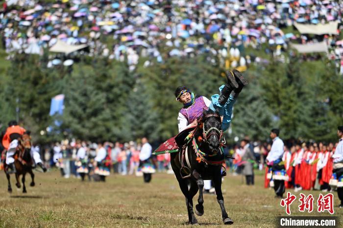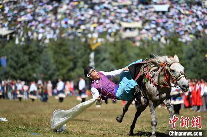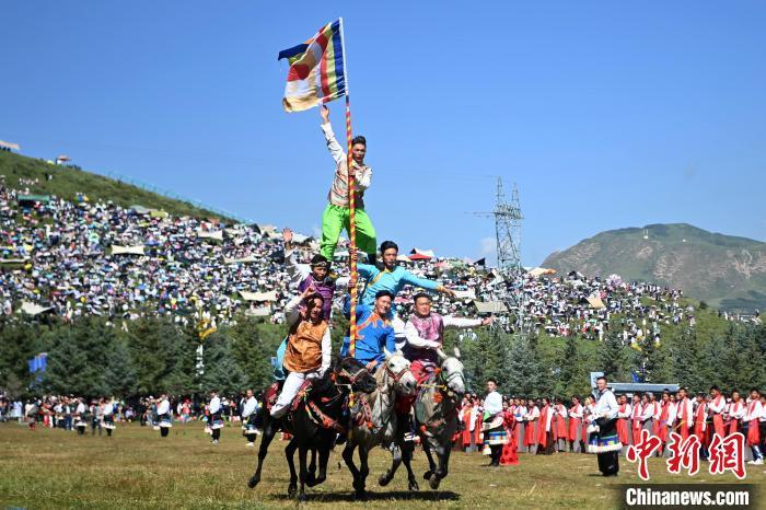 8月4日,藏族騎手在當周草原上表演馬術。當日,第22屆九色甘南香巴拉旅游藝術節在甘肅省甘南藏族自治州當周草原開幕。人們身著節日盛裝載歌載舞、歡聚一堂,馬隊巡游、千人鍋莊舞等活動精彩上演。九色甘南香巴拉旅游藝術節既是民眾浪山聚會的節日盛會,也是展現發展成就、擴大對外開放的重要窗口,更是展示民俗文化、促進廣泛交往交流交融的有效載體。中新社記者 九美旦增 攝