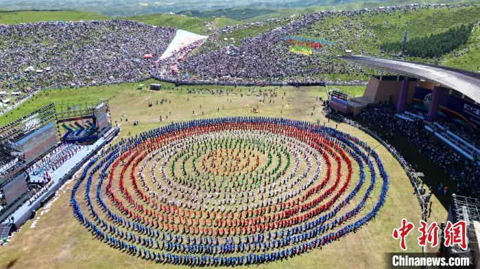 8月4日,第22屆九色甘南香巴拉旅游藝術節在甘肅省甘南藏族自治州當周草原開幕。人們身著節日盛裝載歌載舞、歡聚一堂,馬隊巡游、千人鍋莊舞等活動精彩上演。九色甘南香巴拉旅游藝術節既是民眾浪山聚會的節日盛會,也是展現發展成就、擴大對外開放的重要窗口,更是展示民俗文化、促進廣泛交往交流交融的有效載體。圖為開幕式現場千人鍋莊舞表演。(無人機照片)中新社記者 九美旦增 攝