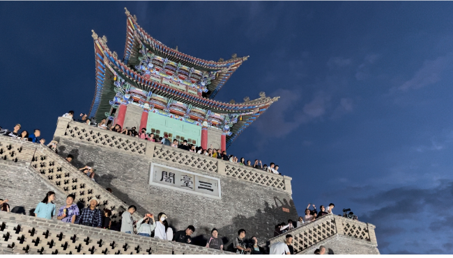 夕陽西下,夜色漸濃,三臺閣上游人如織,山下的萬家燈火隨著夕陽余暉的隱退漸漸蘇醒,一盞盞燈光次第亮起,璀璨如星海。人們紛紛舉起手機和相機,記錄下這一刻的美好。“真不愧是金城蘭州,站在這里俯瞰蘭州是什么神仙視角!”“終于知道夜晚的蘭州為啥被稱作‘蘭哈頓’了,回去好好跟朋友炫炫……”來自陜西的大學生小劉和他的小伙伴們一邊尋找拍照最佳角度,忍不住發出贊嘆。在這一刻,古老的閣樓與游客一起沉醉在蘭山的夏夜晚風中。