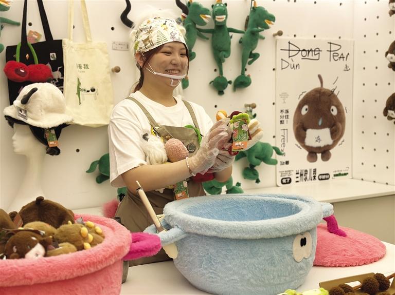 在甘肅省博物館藝術生活館的購物專區,各種食材被做成了毛絨玩具,統一放進加大號的毛絨砂鍋,顧客還可以根據口味“私人訂制”,最后得到一把全食材版的玩具花束。不少網友看過視頻后,留言“很符合年輕人的‘口味’。”