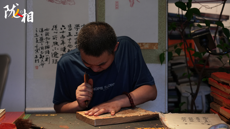 立秋前夕,在“脈望閣”書房里,安靜地只聽見屏氣凝神的呼吸聲,專業的刻刀、常用的手工宣紙、幾塊梨木板,靜寧縣傳統雕版印刷非遺傳承人李安樂正一絲不茍地在有繪畫的梨木上進行雕刻作品。