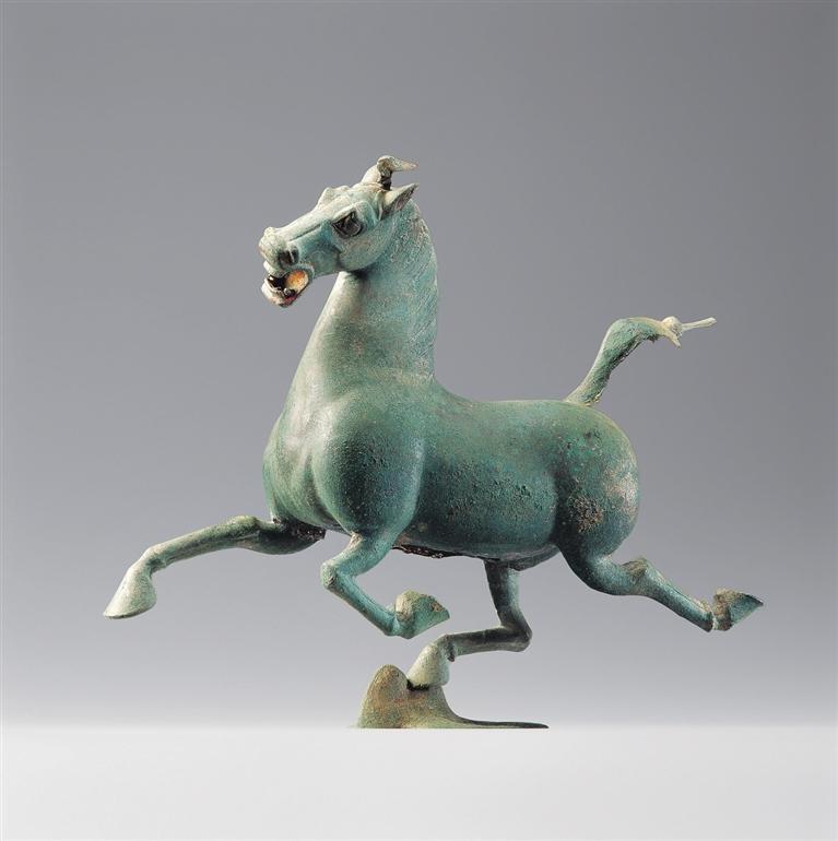 銅奔馬,東漢,1969年武威市雷臺墓出土。馬作奔騰狀,三足騰空,右后蹄踏一展翅飛翔、回首驚顧的飛鳥。奔馬全身著力點集于超掠飛鳥的一足之上,準確地把握了力學平衡。蹄踏飛鳥,表現(xiàn)出馬行迅疾,在鳥驚回首的剎那已經(jīng)超越了飛行的鳥。銅奔馬鑄造精美,構(gòu)思巧妙,為我國青銅藝術(shù)中罕見的杰作,1983年被確定為中國旅游標志,2002年被國家文物局列入首批禁止出國(境)展覽文物目錄。它以卓絕的藝術(shù)造詣千古生輝,成為中華民族勇往直前、積極進取偉大氣質(zhì)的象征。