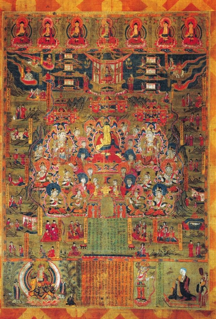 該畫為絹地設色,出自敦煌莫高窟藏經(jīng)洞。畫面中心為說法圖,一佛二菩薩法相莊嚴,諸菩薩、弟子、比丘、比丘尼、優(yōu)婆塞、優(yōu)婆夷等“赴會圣眾”圍繞周圍。兩側(cè)及上方分布15幅經(jīng)變故事圖,以連環(huán)畫形式鋪陳展現(xiàn)《佛說父母恩重經(jīng)》的基本內(nèi)容。其上繪七佛、彌勒與七寶,其下墨書《佛說報父母恩重經(jīng)變》。絹畫最下方自左向右排布地藏菩薩、《繪佛邈真紀》、引路菩薩及比丘尼戒行邈真像。該絹畫保存完整,色彩絢麗,是敦煌《佛說父母恩重經(jīng)》諸變相中,內(nèi)容最復雜,畫面情節(jié)最多,特點最鮮明,風格最獨特的一幅,且有宋淳化二年(公元991年)明確紀年,具有重要的歷史、藝術(shù)和研究價值。