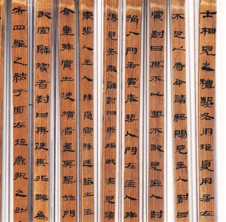 《儀禮》簡,西漢,武威磨嘴子出土。分木質(zhì)和竹質(zhì)兩種,共496枚,編為甲、乙、丙三本,系先編后寫。甲本為《儀禮》17篇中的7篇,乙本僅存《服傳》一篇,丙本僅存《喪服》一篇。該簡冊保存基本完好,與傳世的鄭玄注本不同,應是目前所見《儀禮》的最古寫本,在版本校勘上有很高的價值,且書寫工整秀麗,是漢代墨寫隸書的上品。