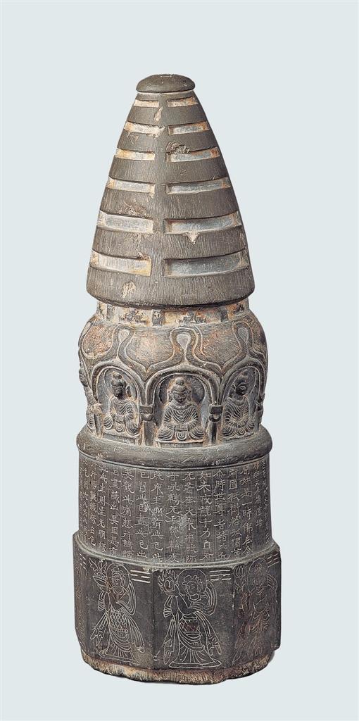 高善穆石造像塔,1969年甘肅省酒泉市出土。寶蓋、相輪、塔頸、塔肩、塔基一應俱全,底部有榫頭。寶蓋頂端中間刻北斗七星,塔腹陰刻《增一阿含經(jīng)·結(jié)禁品》的前半部分及發(fā)愿文,有承玄元年(公元428年)紀年。塔基為八面形,每面陰刻一像,像左側(cè)上方刻八卦符號。該造像塔是現(xiàn)存北涼石塔中保存最完整的一件,在造型上繼承了犍陀羅供養(yǎng)小塔的基本造型特征,又有了新的發(fā)展,如塔頂端的北斗七星,塔基的八卦符號等,體現(xiàn)出佛教文化和中國本土文化之間的碰撞和融合,是研究早期佛教藝術(shù)和佛教思想的重要標本。