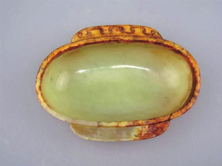 羽觴,多美妙風(fēng)雅的名稱,它的基本形制是扁橢圓,弧形壁,淺腹平底,餅形足或高足,口緣兩側(cè)各有一個(gè)半月形耳或方形耳。這種形制始于春秋戰(zhàn)國(guó),是由橢杯、舟等演變而來,盛行于秦漢至魏晉南北朝,唐代以后便很少見到。其材質(zhì)有漆木、青銅、金、銀、玉、陶等,其中玉耳杯由諸侯王、列侯等身份地位比較高的人使用,漆耳杯使用者范圍較廣泛,上至帝王諸侯,下至一般貴族均可使用。