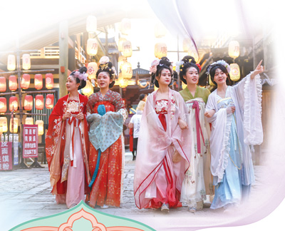 身著漢服的游客在湖北省襄陽市唐城景區游玩。   楊 東攝(影像中國)