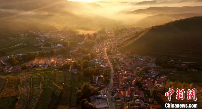 8月14日晚,蘭州市榆中縣馬坡鄉(xiāng),夕陽在云海里翻滾,映照大地和村莊城鎮(zhèn),美不勝收。圖為日落映照城鎮(zhèn)。牛遠(yuǎn)明 攝