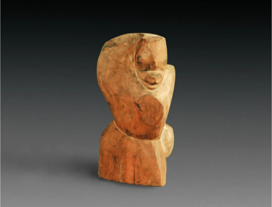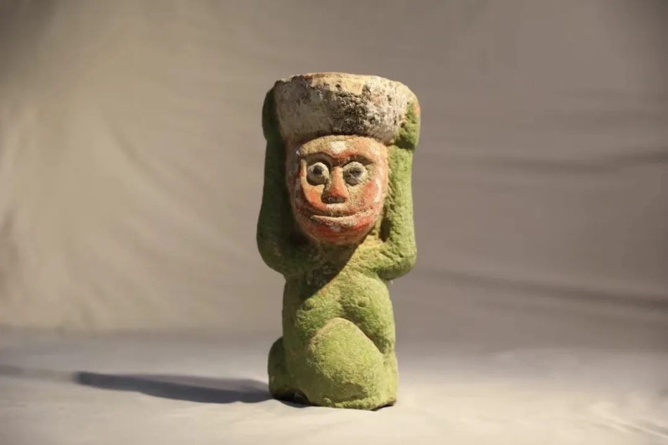 彩繪木猴,漢代,一級文物。武威市磨嘴子漢墓出土。寬 17.3 厘米,高 32.5 厘米。木質,由整木削制而成,全身施黑、白、紅三彩,木猴呈蜷縮、蹲臥狀,刀法簡潔質樸,充滿藝術感。