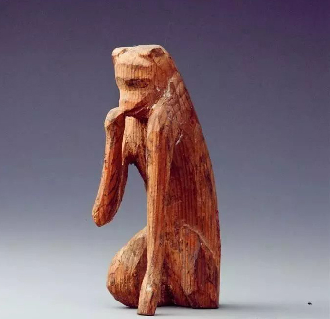 木猴,東漢,1957年甘肅武威磨嘴子出土。此猴跪坐,頭微低,左前肢垂直撐地,右前肢伸至嘴部,似在抿嘴偷笑,又似在品嘗食物。整個雕塑用黑、紅兩色彩繪,形體小巧,刀法簡練,將一只調皮的猴子微感惶惑的瞬間神態刻畫入微。該作品用一塊木頭雕成,是漢代雕刻中的佳作。